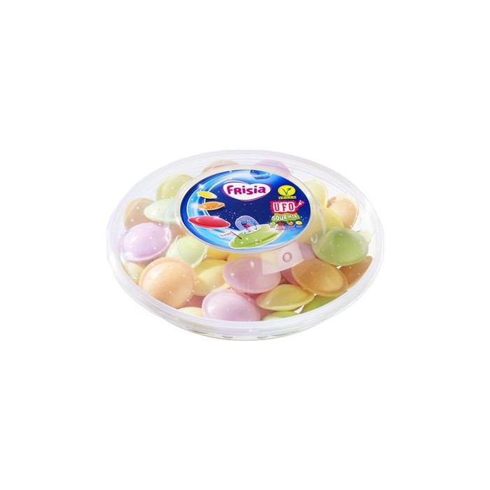 De iconische Frisia UFO’s zijn terug! Deze luchtige schuimpapiertjes met een verrassend zure poedervulling zijn al decennialang favoriet bij jong en oud. In deze verpakking vind je 6 zakjes van 60g, ideaal om te delen, uit te delen of gewoon nostalgisch van te genieten. Een echte klassieker in een modern jasje!